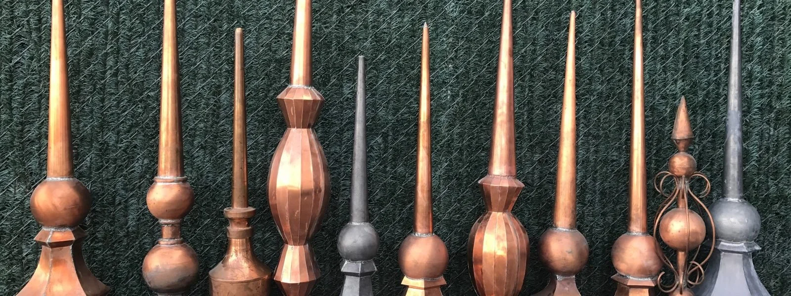 A copper finial puts the finishing touch on any roof line! Finials bring elegance and beauty to any home. Purely decorative, copper finials help to draw the eye from open, expansive roofs. Our spires are made from 16 oz. copper and soldered together. With limitless possibilities in the variety of shapes and textures, there’s a finial that will fit every decor.